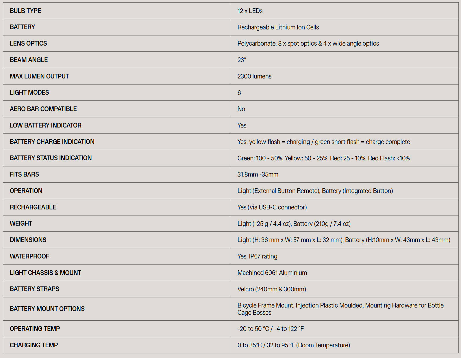 With its handle bar mounted remote button you can easily toggle between the 6 different light modes, quickly adapting to riding conditions. The external battery secures easily to your bike frame for convenient setup and recharging, whilst also allowing you to easily monitor your battery status.